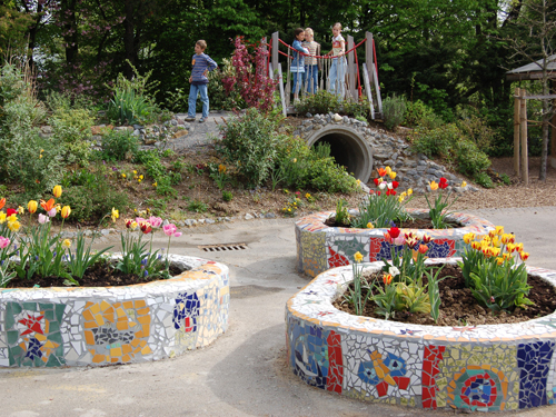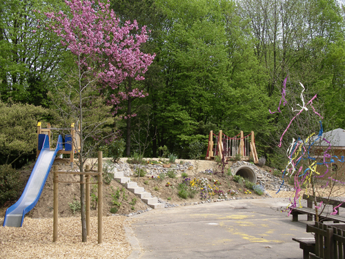 • Modellierung des entsiegelten Bereichs zu einer bepflanzten Berg- und Muldenlandschaft mit Rutsche und Aussichtsplattform